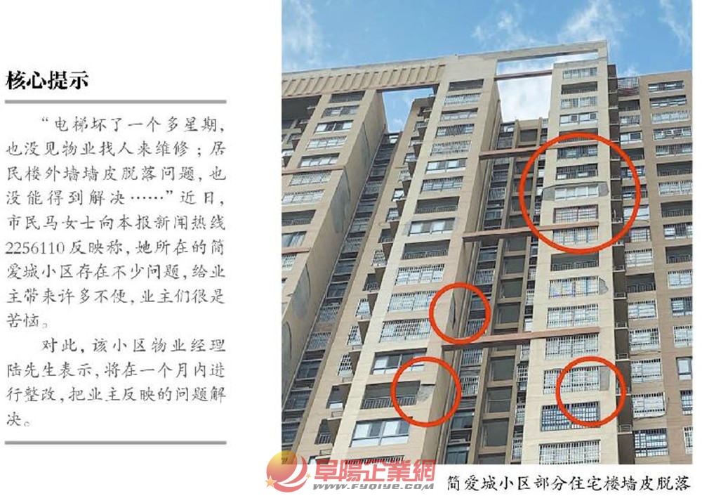 業(yè)主反映:小區(qū)里存在不少問題,給生活帶來不便 “我們這一棟樓共有32層,每層有7戶,現(xiàn)在200多戶人家只有一部電梯能用,有時(shí)候得等半個(gè)小時(shí)才能乘上?!奔易「逢?yáng)經(jīng)濟(jì)技術(shù)開發(fā)區(qū)簡(jiǎn)愛城小區(qū)12號(hào)樓的馬女士告訴記者,自今年8月16日起,她家所在的樓棟兩部電梯有一部損壞,已被物業(yè)關(guān)停,給出行帶來不便。 該小區(qū)5號(hào)樓、7號(hào)樓、9號(hào)樓、10號(hào)樓、11號(hào)樓的業(yè)主,也遇到了和馬女士同樣的問題,一直沒有解決。8月25日,記者來到簡(jiǎn)愛城小區(qū)采訪時(shí)了解到,目前這幾棟樓的電梯,也只有一部可以正常運(yùn)行。 7號(hào)樓業(yè)主李先生說,今年以來,他家所在樓棟的電梯反復(fù)出現(xiàn)問題,甚至發(fā)生過電梯困人的情況。“我們這幾棟都是高層,每棟都有200多戶,眼看就要開學(xué)了,孩子上學(xué)、大人上班,特別耽誤時(shí)間?!?/font> 在12號(hào)樓,記者看到有兩部電梯,但其中一部上貼有“因電梯損壞,需采購(gòu),給您帶來的不便請(qǐng)諒解”提示語(yǔ),該電梯也處于停運(yùn)狀態(tài)。 此外,記者還了解到,該小區(qū)經(jīng)常有住戶將電動(dòng)車推進(jìn)電梯進(jìn)入家中或在樓道內(nèi)充電。小區(qū)業(yè)主張女士告訴記者:“之所以有那么多人推電動(dòng)車上樓,主要原因是充電樁不夠用?!庇浾咦咴L看到,該小區(qū)共有12棟居民樓,其中有8棟為高層住宅,約有業(yè)主2000戶,而電動(dòng)車充電樁僅有6處、約600個(gè)充電口。 小區(qū)業(yè)主趙先生表示,小區(qū)居民樓外墻墻皮此前曾多次脫落過,還將自己的車輛砸壞了。在他的指引下,記者看到有幾棟住宅樓的外墻墻皮確實(shí)存在脫落情況。“小區(qū)里存在的問題太多了,期盼物業(yè)盡快整改?!壁w先生說。 物業(yè)承諾:一個(gè)月內(nèi)解決這些問題 隨后,記者來到該小區(qū)物業(yè)——七度物業(yè)簡(jiǎn)愛城項(xiàng)目處辦公室。 對(duì)電梯損壞影響出行問題,陸先生表示,8月份是該小區(qū)電梯年檢時(shí)間,本次年檢中發(fā)現(xiàn)了不少問題,多部電梯存在安全隱患,需要養(yǎng)護(hù)、維修。“比如7號(hào)樓,關(guān)停的那部電梯鋼絲繩需要更換;9號(hào)樓關(guān)停的電梯對(duì)重緩沖器出現(xiàn)了問題,因電梯保修期已過,需要重新購(gòu)買零配件,并需在全體業(yè)主同意下動(dòng)用公共維修基金?!蹦壳拔飿I(yè)已將電梯情況報(bào)至開發(fā)區(qū)管委會(huì)相關(guān)部門,正等待招標(biāo)定價(jià)方案,將在一周內(nèi)解決電梯故障,保證業(yè)主出行。 對(duì)業(yè)主反映的電動(dòng)車進(jìn)入電梯情況,陸先生表示,將在電梯內(nèi)安裝智能攝像頭,發(fā)現(xiàn)電動(dòng)車入內(nèi)會(huì)停止運(yùn)行。“我們還會(huì)每天安排工作人員上樓檢查,發(fā)現(xiàn)電動(dòng)車樓道內(nèi)充電將立即制止并推車下樓?!蔽飿I(yè)將配合社區(qū)對(duì)違規(guī)充電進(jìn)行整改。同時(shí),將會(huì)盡快聯(lián)系充電樁公司,增加幾處充電棚,滿足業(yè)主充電需求。 “至于墻皮脫落問題,我們已經(jīng)把材料提交到住保部門,批復(fù)下來后,我們會(huì)第一時(shí)間安排工人進(jìn)行修繕。”陸先生說,對(duì)于此次業(yè)主反映的多個(gè)問題,物業(yè)將在一個(gè)月內(nèi)解決。 來源:潁州晚報(bào) |